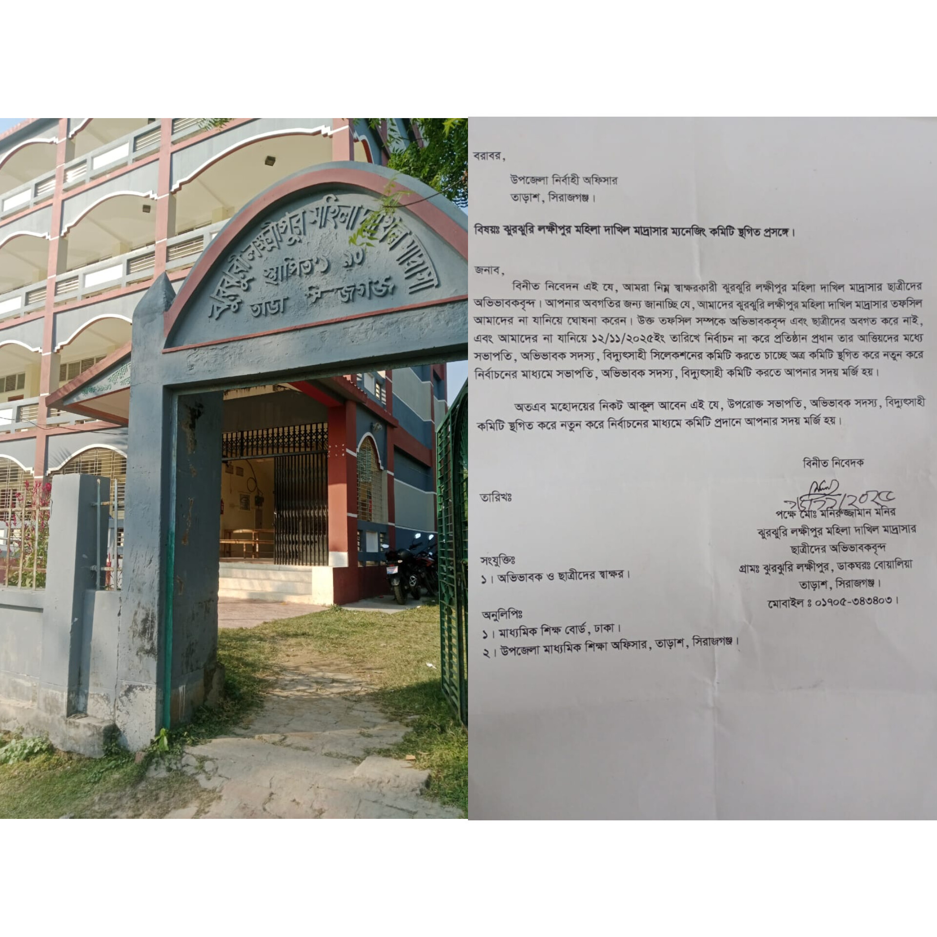 তাড়াশ (সিরাজগঞ্জ) প্রতিনিধিঃ সিরাজগঞ্জের তাড়াশে ঝুরঝুরি লক্ষীপুর দাখিল মাদ্রাসায় ম্যানেজিং কমিটি গঠনে অনিয়মের অভিযোগ এনে স্থগিত চেয়েছেন অভিভাবক ও এলাকাবাসী। তারাশ উপজেলা মাধ্যমিক শিক্ষা কর্মকর্তার দপ্তরসহ সরকারের বিভিন্ন দপ্তরে লিখিত অভিযোগ দাখিল করেনে।