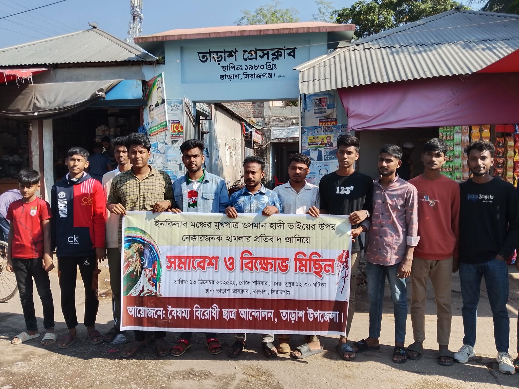 তাড়াশ (সিরাজগঞ্জ) প্রতিনিধি: সিরাজগঞ্জের তাড়াশে ইনকালাব মঞ্চের মুখপাত্র ওসমান হাদীর উপর নেক্কারজনক হামলার প্রতিবাদে বৈষম্য বিরোধী ছাত্র আন্দোলন তাড়াশ উপজেলা শাখার আয়জনে প্রতিবাদ সমাবেশ ও বিক্ষোভ মিছিল অনুঠিত হয়েছে।
