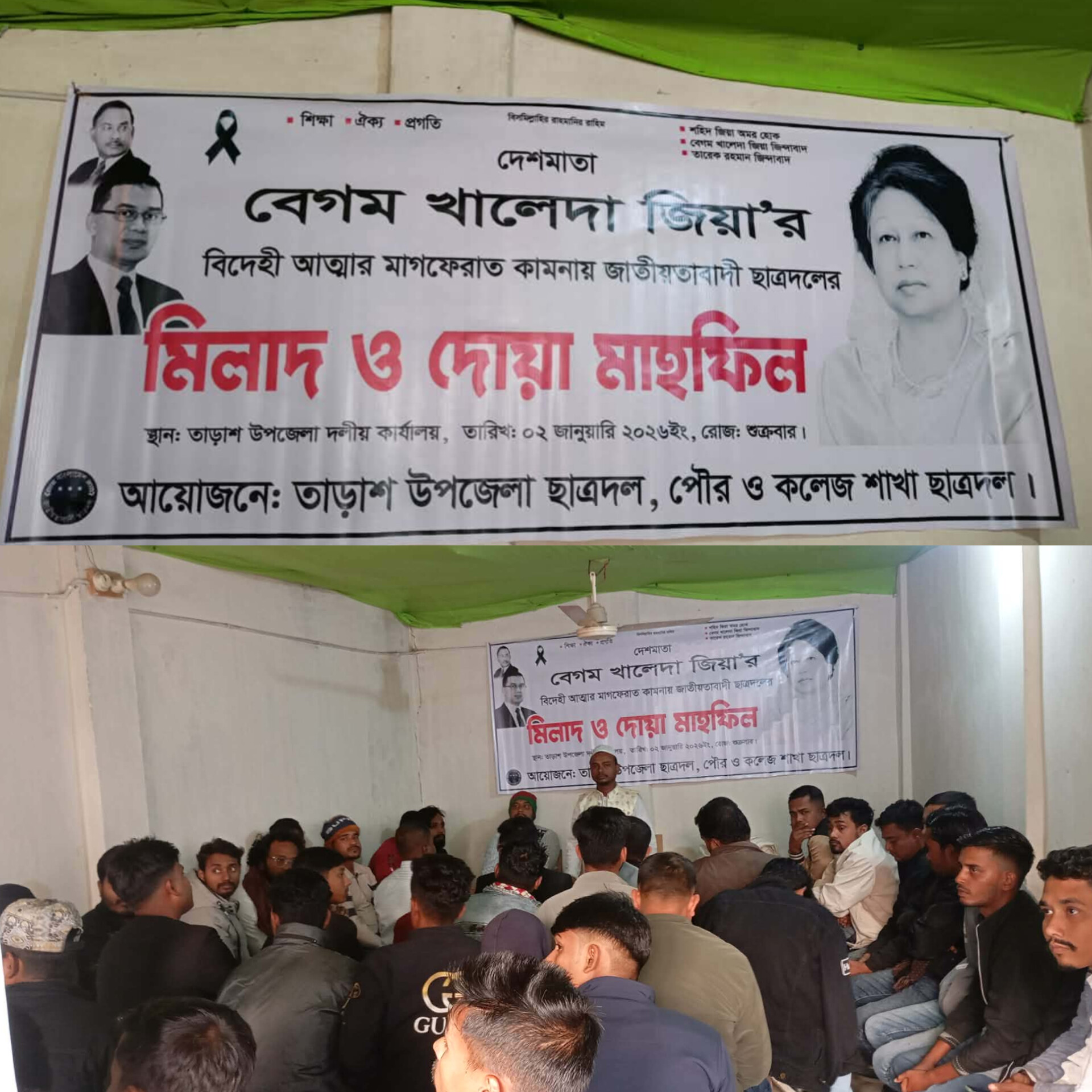 তাড়াশ (সিরাজগঞ্জ) প্রতিনিধিঃ সিরাজগঞ্জের তাড়াশে বেগম খালেদা জিয়ার রুহের মাগফেরাত কামনা করে ছাত্রদলের উদ্যোগে দোয়া মাহফিল অনুষ্ঠিত হয়েছে। শুক্রবার বাদজুমা উপজেলা বিএনপির দলীয় কার্যালয়ে উপজেলা ছাত্রদল, পৌর ছাত্রদল ও তাড়াশ ডিগ্রী কলেজ শাখা ছাত্রদলের আয়োজনে ওই দোয়া মাহফিল অনুষ্ঠিত হয়। এ সময় উপস্থিত ছিলেন তাড়াশ উপজেলা ছাত্রদলের সদস্য সচিব শাহাদৎ হোসাইন, যুগ্ন আহ্বায়ক রাসেল রানা শাহীন, তানভীর মাসুদ, নাজমুল হুদা, পৌর ছাত্রদলের যুগ্ন আহ্বায়ক কাওসার মানিক, জেলা ছাত্রদলের সহ-সভাপতি আবদুল্লাহ আল সাকিব, সাংগঠনিক সম্পাদক হাবিব খন্দকার, সহ-সাংগঠনিক সম্পাদক মেহেদী হাসান, নুরুন নবি প্রমুখ। দোয়ার আগে ছাত্রদলের সদস্য সচিব শাহাদৎ হোসাইন গণতন্ত্রের মানস কন্যা, তিনবারের প্রধানমন্ত্রী বেগম খালেদা জিয়ার বর্ণাঢ্য রাজনৈতিক জীবন তুলে ধরেন এবং বলেন জাতি এক মাহান অভিভাবককে হারালো। শিক্ষা,ঐক্য ও প্রগতিকে সামনে রেখে খালেদা জিয়ার আদর্শে অনুপ্রাণিত হয়ে আমাদের সামনে এগিয়ে যেতে হবে। উল্লেখ্য এসময় উপজেলা জামে মসজিদের ইমাম আব্দুস সালাম মরহুমা বেগম খালেদা জিয়ার রুহের মাগফেরাত কামনা করে এক বিশেষ দোয়া পরিচালনা করেন।